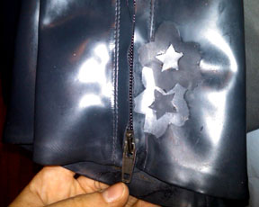 Custom Cherry Blossom design requested by Goddess Narcissa to match her famous tattoo! Applique repairs torn latex on her thigh high boots, and decorates the other in the pair. Restricted Design, NOT AVAILABLE– however custom work to match your designs and tattoos IS!